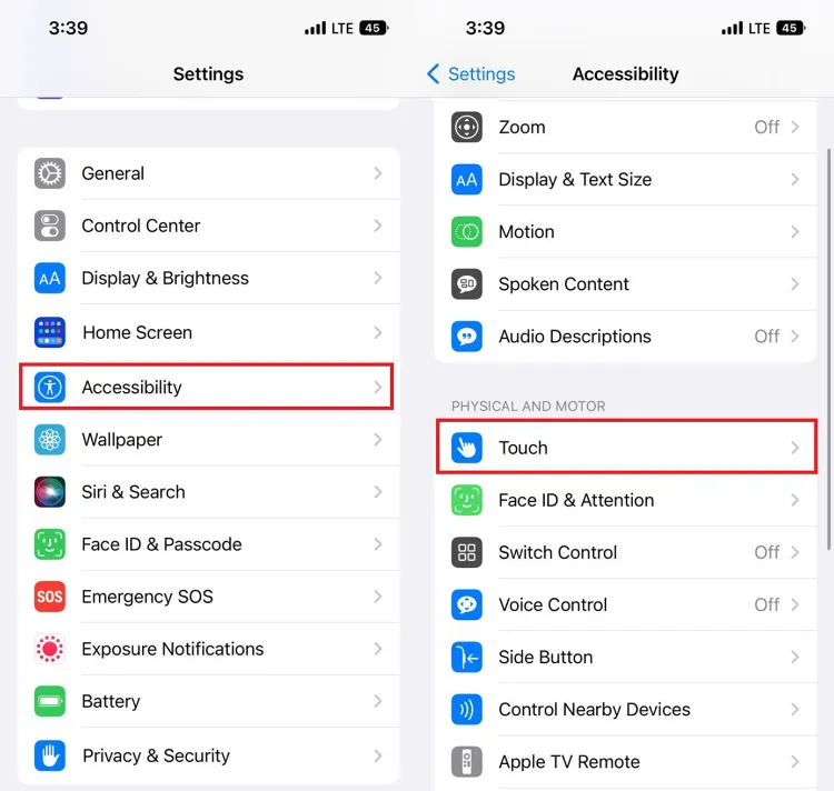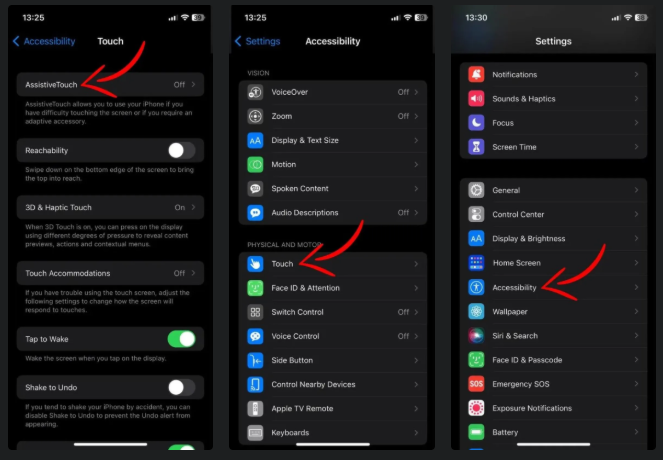 ۲. به Accessibility > Touch > AssistiveTouch بروید.